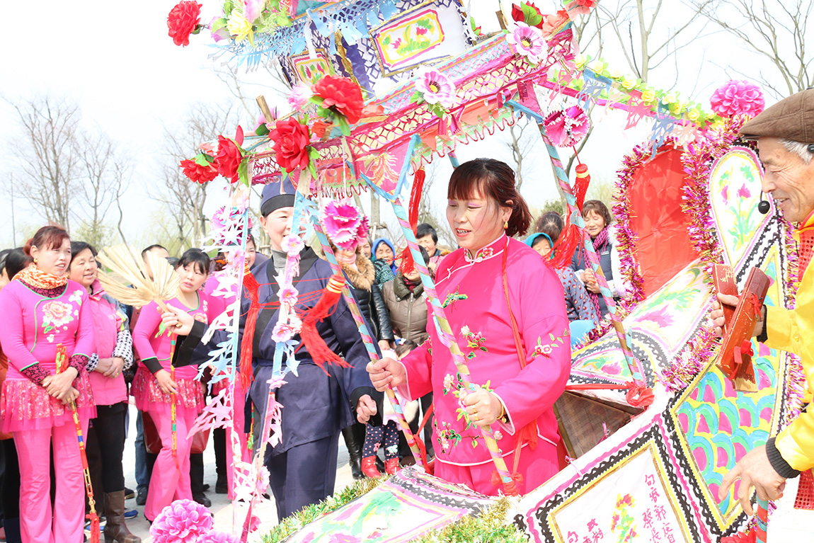 铿锵有力的锣鼓敲起来,欢快活泼的花船荡起来,悦耳动听的小调唱起来,精彩的花船表演吸引了十里八乡的村民驻足观看。大鼓一敲,锣钹一响,身穿大红褂的船娘提着花船就上场了。只见她立于船舱,肩携红绳,手握船边,轻摇慢舞移步前行,犹如一艘船在水中游动。而小丑模样的撑船者则站在船头,出语通俗幽默滑稽。配合着剧情的发展,花船时而轻舟荡漾,时而激流勇进,场面十分热闹。